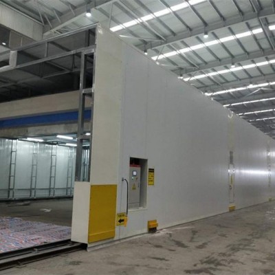 整体移动喷漆房的设计目的是为了满足磨削或喷涂较大工件的需要。一般每套对应2-3个排气净化站。当哪个工位上的工件需要喷漆时,房间移动到那个工位,其他工位可以继续抛光。当室内的工件涂漆后,控制移动室移动到抛光工件工位。这种设计可以实现大型工件的不间断连续涂装。房屋为钢结构,房屋的立柱下有两个电动行走机构,行走机构沿地面轨道行走。移动房两端安装电动卷帘门。当房间行走时,门上升,当房间到达位置时,门着陆并关闭。门和行走机构由电气控制部分连锁控制。门升起后,房间可以移动和行走。